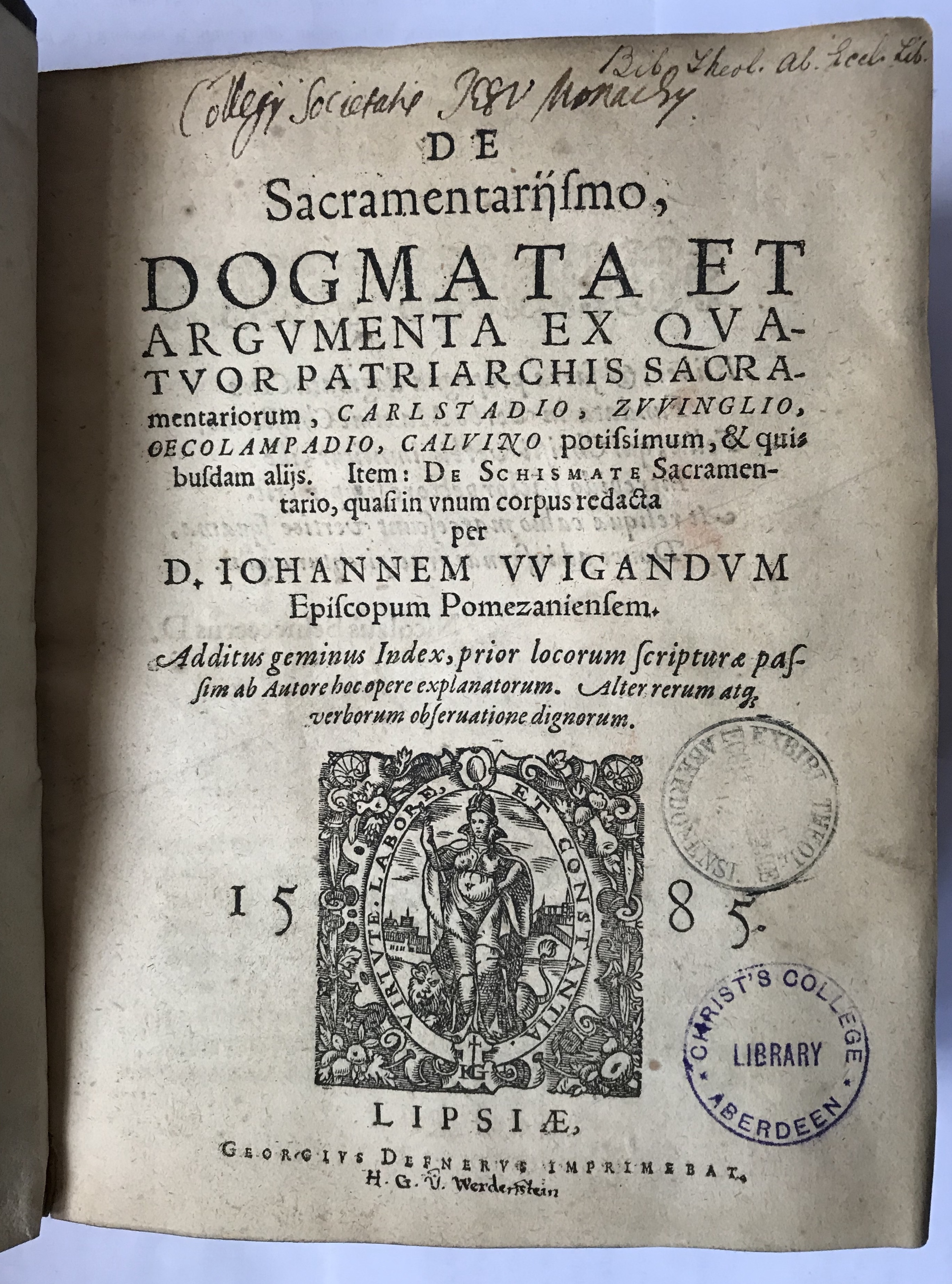 Johann Wigand (1523-87) was a German Lutheran cleric and theologian. He served as Bishop of Pomerania and took part in the Reformers’ debates about sacraments, which focused on the issue of the Lord’s Supper. The participants to these debates were important theologians from different branches of the Reformation. The Lutherans – such as Johannes Brenz, Niels Hemming, Nikolaus Amsdorf and Tilemann Hesshusen – were opposed to the representatives of Reformed confessions, such as John Calvin, Heinrich Bullinger, Theodore de Beze, Pier Martire Vermigli, Jan Laski and Valerand Poullain. In this work, Wigand illustrated and countered the arguments of Karlstadt, Zwingli, Oecolampadius and Calvin.