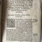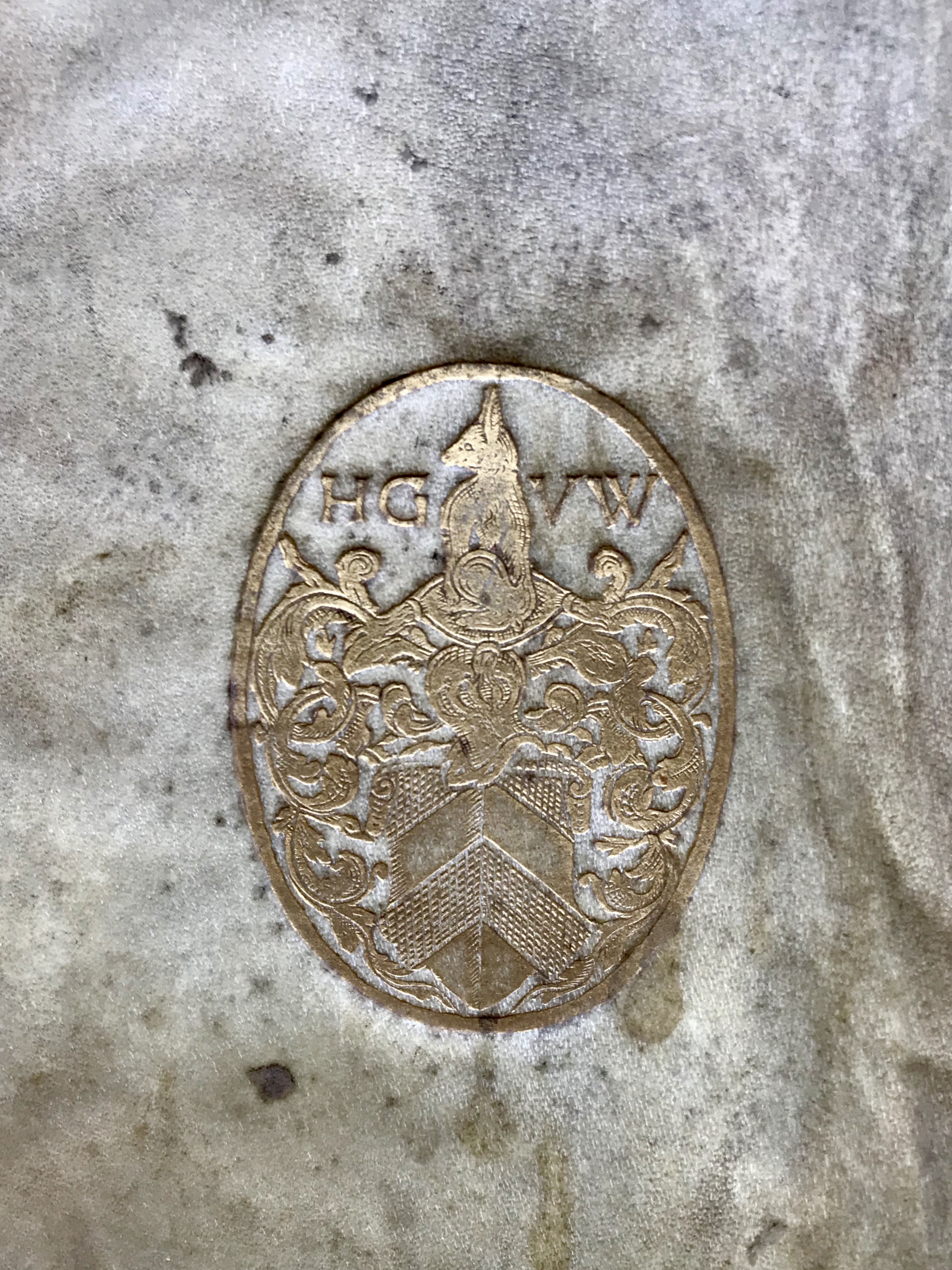 4to, ff. 16, 582, α-β8 A-3F8 3G6 3H-4D8 (Ggg6 blank). Mainly Italic letter, some Roman, sporadic Greek and Hebrew words. Large decorated initials, head and tailpieces. Oval vignette within a floral border of a female figure holding a sceptre flanked by a lion, architectural view in the background, on title page with motto “virtute, labore et constantia”. Second t-p marked with old metal clip on margin (Hhh1): “Exegesis colloquiorum aliquot, cum sacramentariis habitorum”, imprint dated “1584”. Verso of final leaf with large elaborate woodcut of Christopher bearing Jesus with inscribed biblical verse (“Fortitudo mea et laus mea Jehoua et factus est mihi in salutem Exodi 15”) and repeated imprint. Two library stamps on t-p of Christ College and the theological library of Aberdeen University, occasionally repeated throughout. “Of the Jesuit College of Munich” in early Latin handwriting on t-p and earlier shelf mark on front endpaper, plus another later label with library no. Bound in contemporary limp vellum, yapp edges, remains of ties and gilt stamped coat of arms of Johannes Georg von Werdenstein (1542-1608) at centre of both covers. Ink title to spine. Evenly though lightly browned throughout. A fine copy with a prestigious provenance.