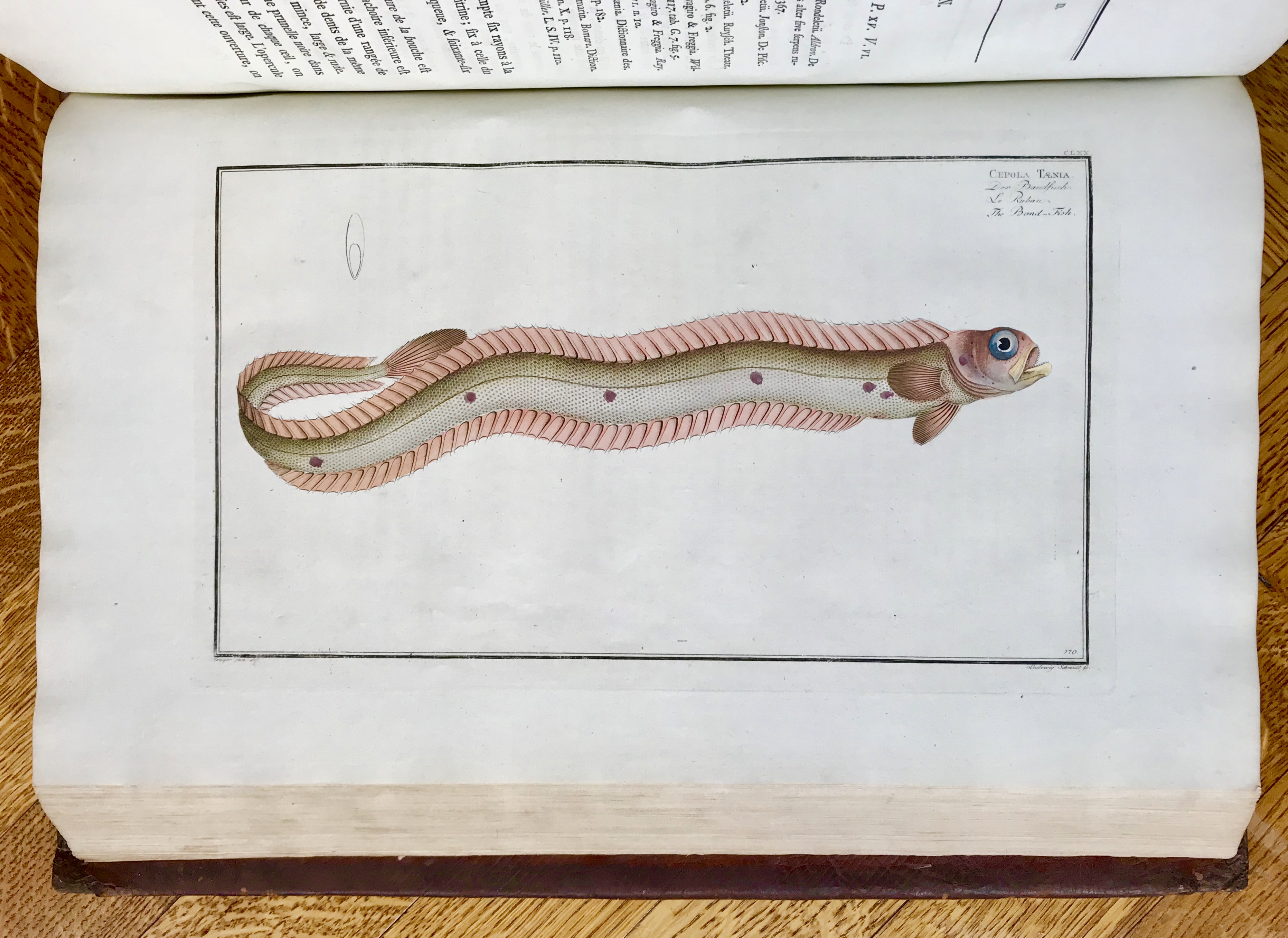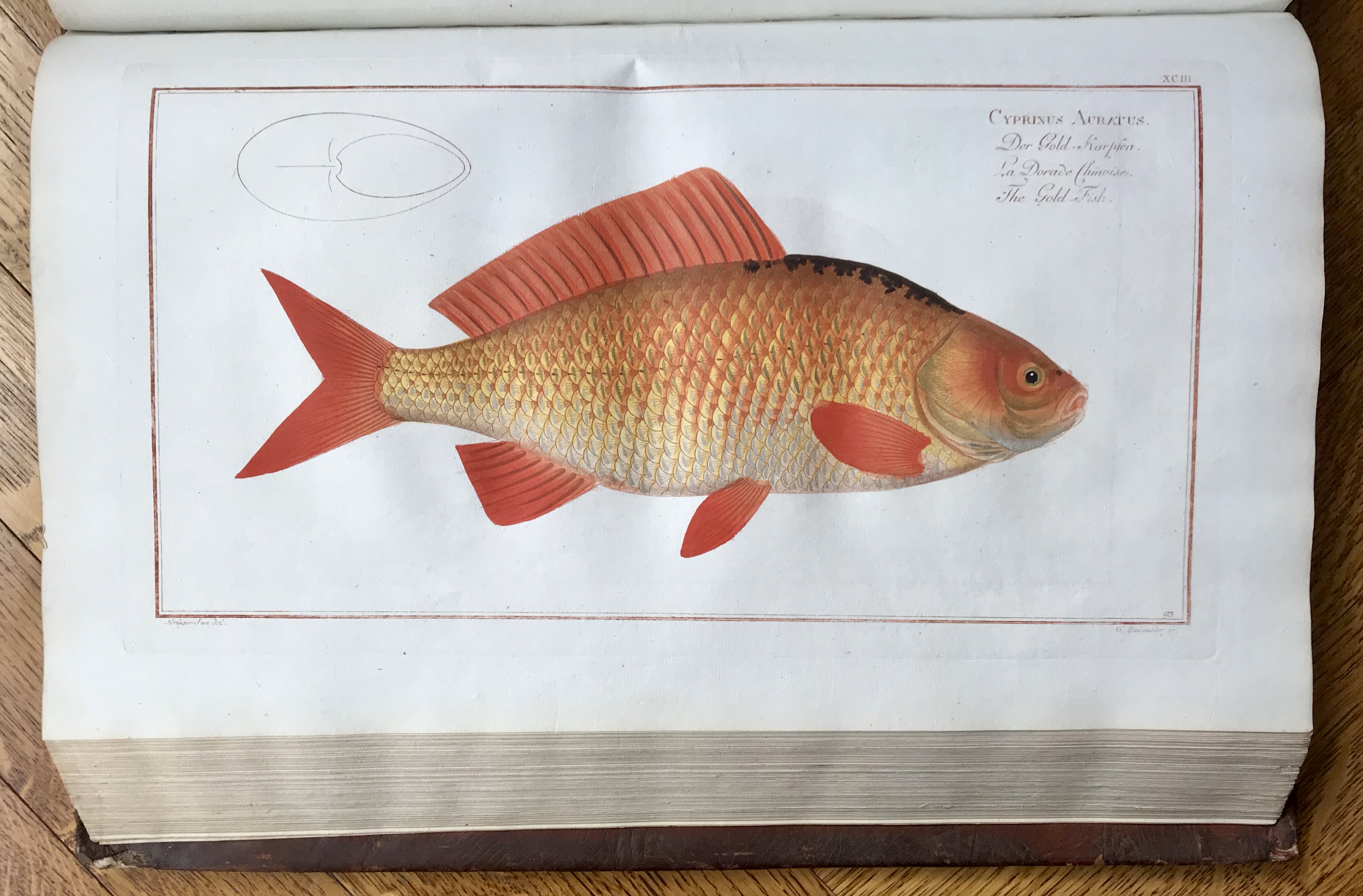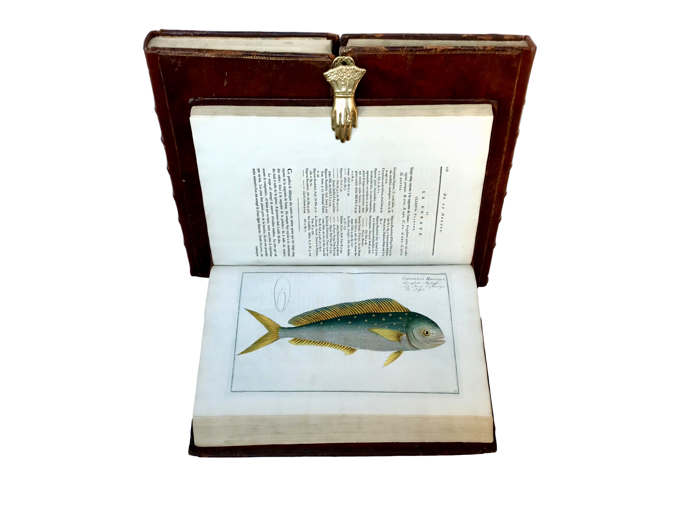 FIRST FRENCH EDITION. Folio (leaves ca. 46 x 28 cm; binding ca. 47.5 x 29.5 cm). Parts 1-6 bound in 3 volumes, half-title and title to each part, with elaborately engraved vignette illustrating fishing scenes for each title by D. Berger after F.C.W. Rosenberg. Complete, with 216 fine hand-coloured engraved plates, occasionally heightened with gold, silver and bronze pigments to reproduce the shiny reflective scales of fish. In clean condition, crisp and with good margins. Bound in contemporary full Russia with Greek key gilt border decoration to outer edges; skilfully re-backed, gilt decorated spines. Marbled end-papers. An excellent copy.