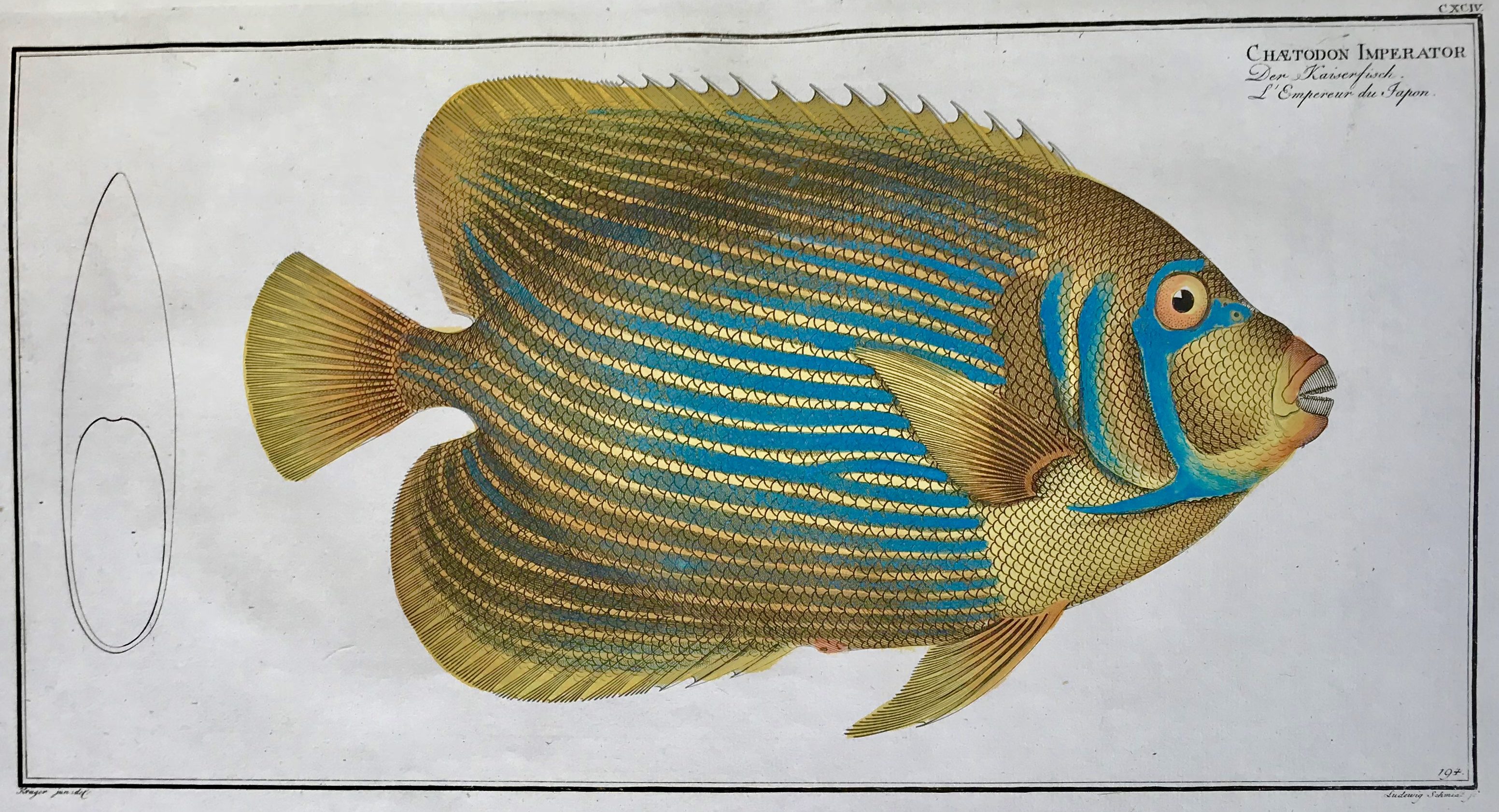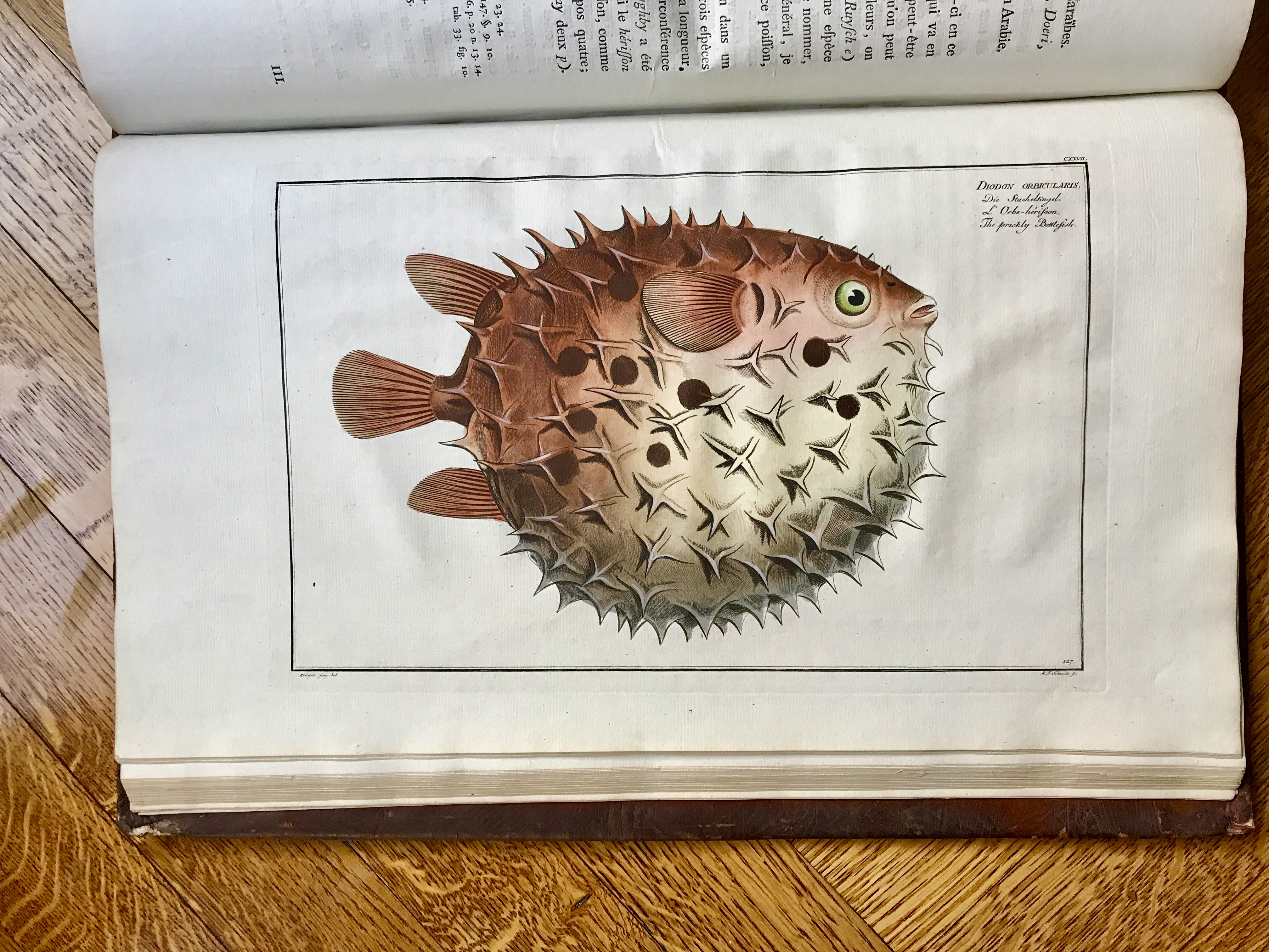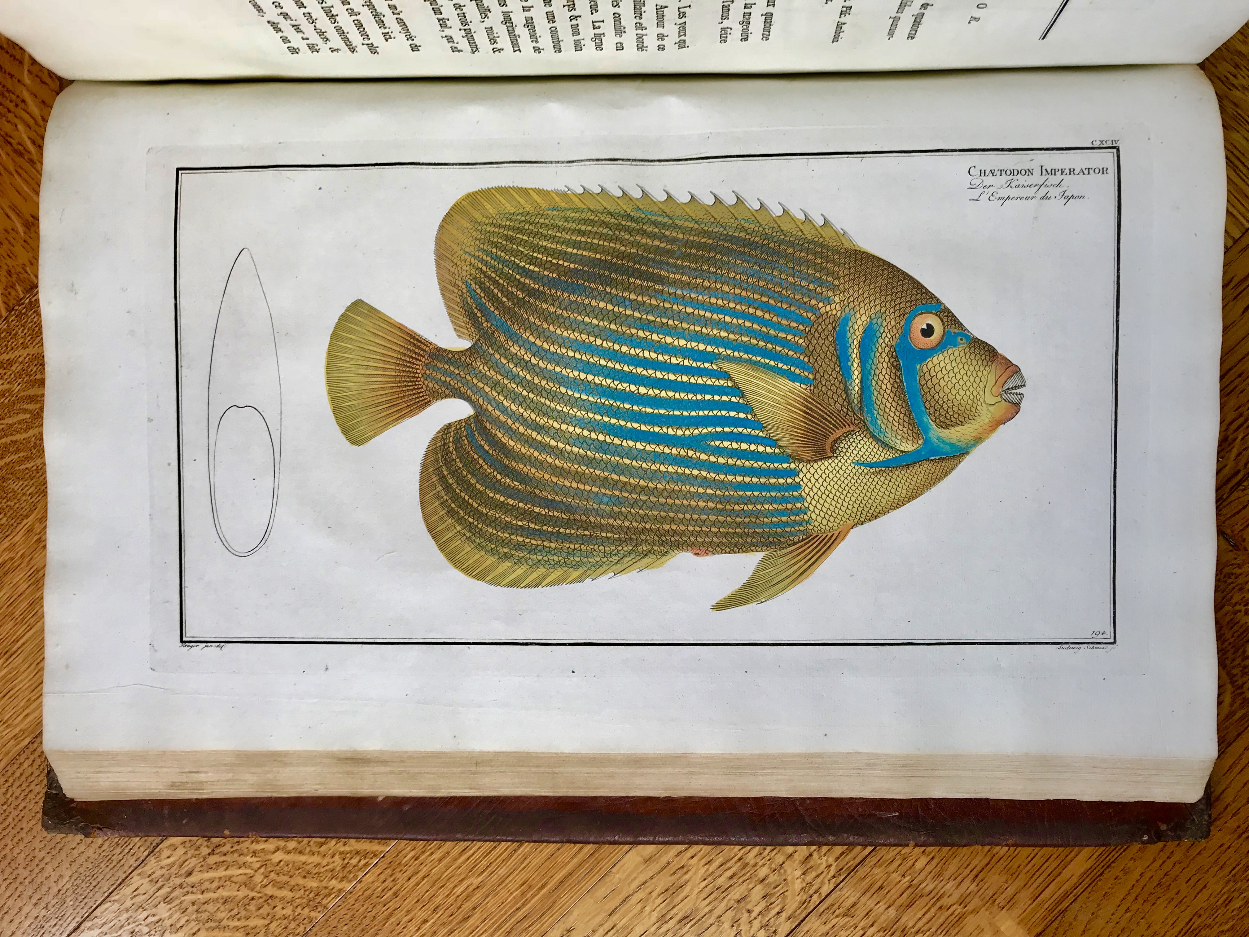 Marcus Elieser Bloch (1723-1799) was a German doctor and naturalist. This is a remarkable copy of the first six parts of his masterpiece on ichthyology (the science of fishes), which Brunet defined “the most beautiful that we have about that part of natural history”. First published in German in a quarto edition, this much larger and finer second edition of Bloch’s work was translated into French by J.-C. Laveaux. Nissen described it as “the finest illustrated work on fishes ever produced. The plates, by a variety of artists and engravers, are outstandingly coloured, and are heightened with gold, silver, and bronze to produce the metallic sheen of fish scales.” The engravings were based on drawings from the author’s own collection, which included around 1,500 items. His was among the most extensive collections of illustrations devoted to fishes in private hands at the time. The second 6 parts (7-12) of this monumental set in 12 parts containing a total of 432 plates were finished in 1797.