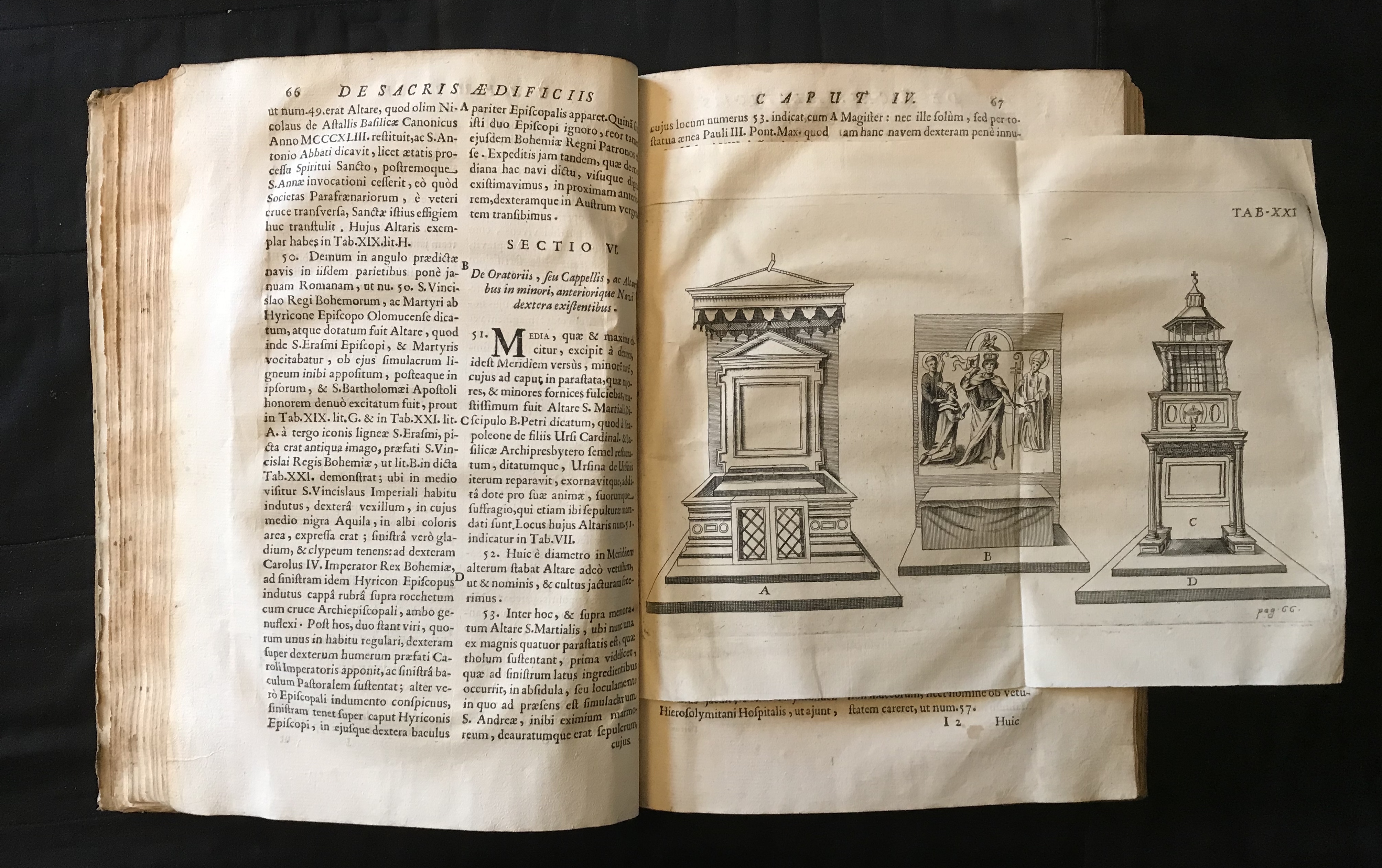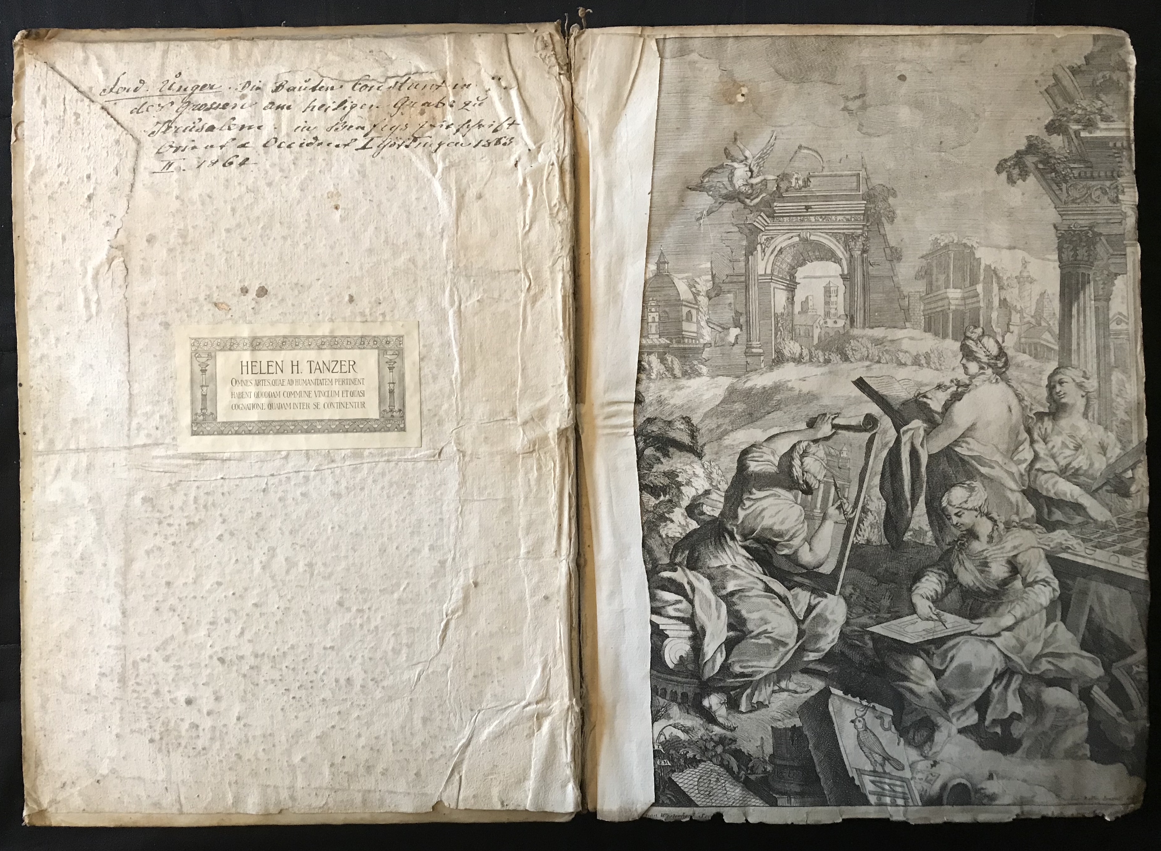 FIRST EDITION. Folio, pp. (16), 217, (3). Roman and Italic letter. Coat of arms of one of the dedicatees, Pope Innocent XII (the other addressee is Cardinal Barberini), on the title page and full-page engraved frontispiece by Arnoldo van Westerhout (1651 – 1725), after Giovanni Battista Leonardi (1660-1703). Head- and tail-pieces and large historiated initials. With 34 plates (0f 35; lacking plate 4), showing maps of churches and religious monuments, views, architectonic details, mosaic decorations and frescos from the monumental buildings established by Constantine the Great, the first Christian Emperor of the Roman Empire. Some tears, mostly negligible but at times affecting the text, to margins of plates no. 3 and 7, 25, 35 (29 and 30 with small worm tracks and holes). Other small tears to leaf B4, C, E2, H, N2, Q3, S, Dd2. Leaf K with outer lower corner torn with loss of a few word endings. Generally very clean and fresh. A few early doodles and sketches throughout and on then front cover. Bound in contemporary vellum over boards, spine in six compartments with raised bands. Spine caps worn and a little defective, cover edges rubbed. Red morocco label with gilt lettering. Bookplate of Helen H. Tanzer and German inscription in ink dated 1863 on front pastedown. Bookseller’s label glued to rear pastedown plus other label certifying the binding was cleaned in 1980. An excellent copy, notwithstanding the missing plate.