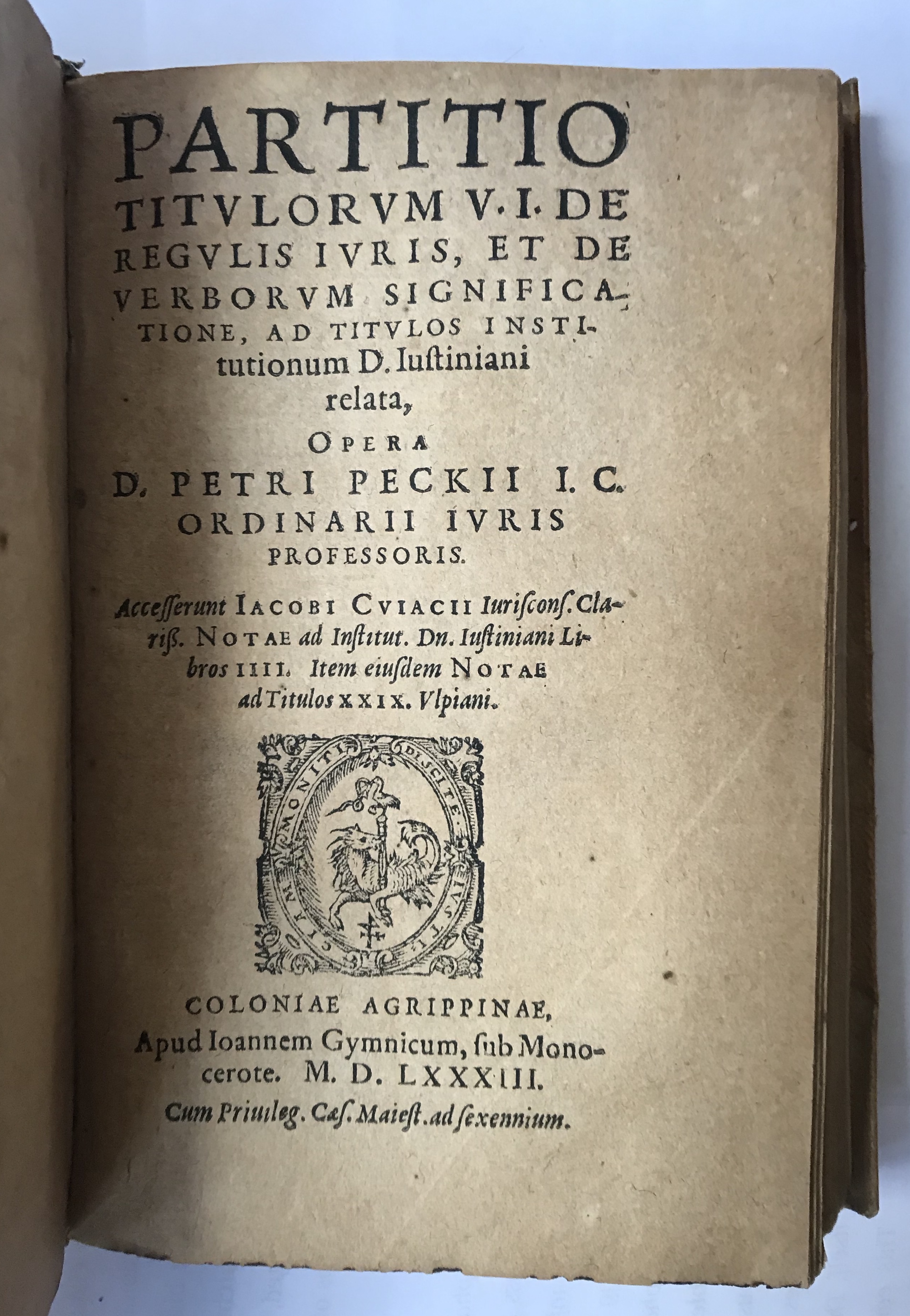 CUJAS, Jacques, Interpretationes in Julii Pauli receptarum sententiarum ad filium libris 5; [with] Id., Notae ad libros quatuor institutionum domini Iustiniani; Notae ad titulos XXIX Ulpiani; [with] PECK, Pierre, Partitio titolorum V.I. de regulis iuris, et de verborum significatione, ad titulos institutionum domini Iustiniani relata; [with] CUJAS, Jacques. Liber singularis consultationum,