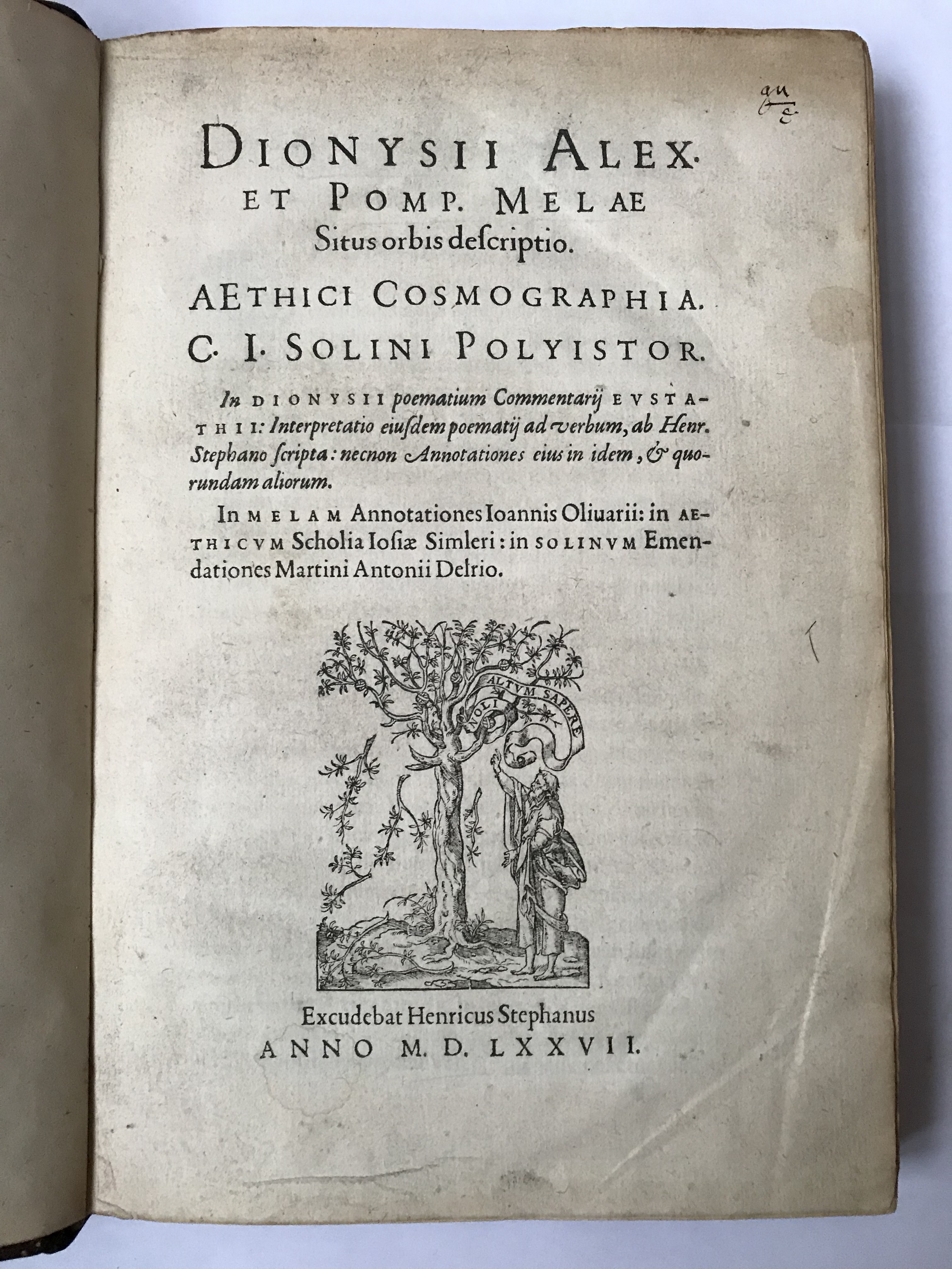 DIONYSIUS PERIEGETES; ESTIENNE, Henri, (Ed.). Dionysii Alex. Et Pomp. Melae Situs Orbis Descriptio, Aethici Cosmographia. C.I. Solini Polyhistor. In Dionysii Poematium Commentariii Eusthathii: Interpretatio Eiusdem Poematii Ad Verbum, Ab Henr. Stephano Scripta: Necnon Annotationes. [with] POMPONIUS MELA; OLIVER, Pedro Juan (Ed.). Situs orbis descriptio. [with] PSEUDO-JEROME; SIMMLER, Josias (Ed.). Aethici cosmographia [with] SOLINUS, GAIUS JULIUS; DELRIO, Martin (Ed.). Polyistor.