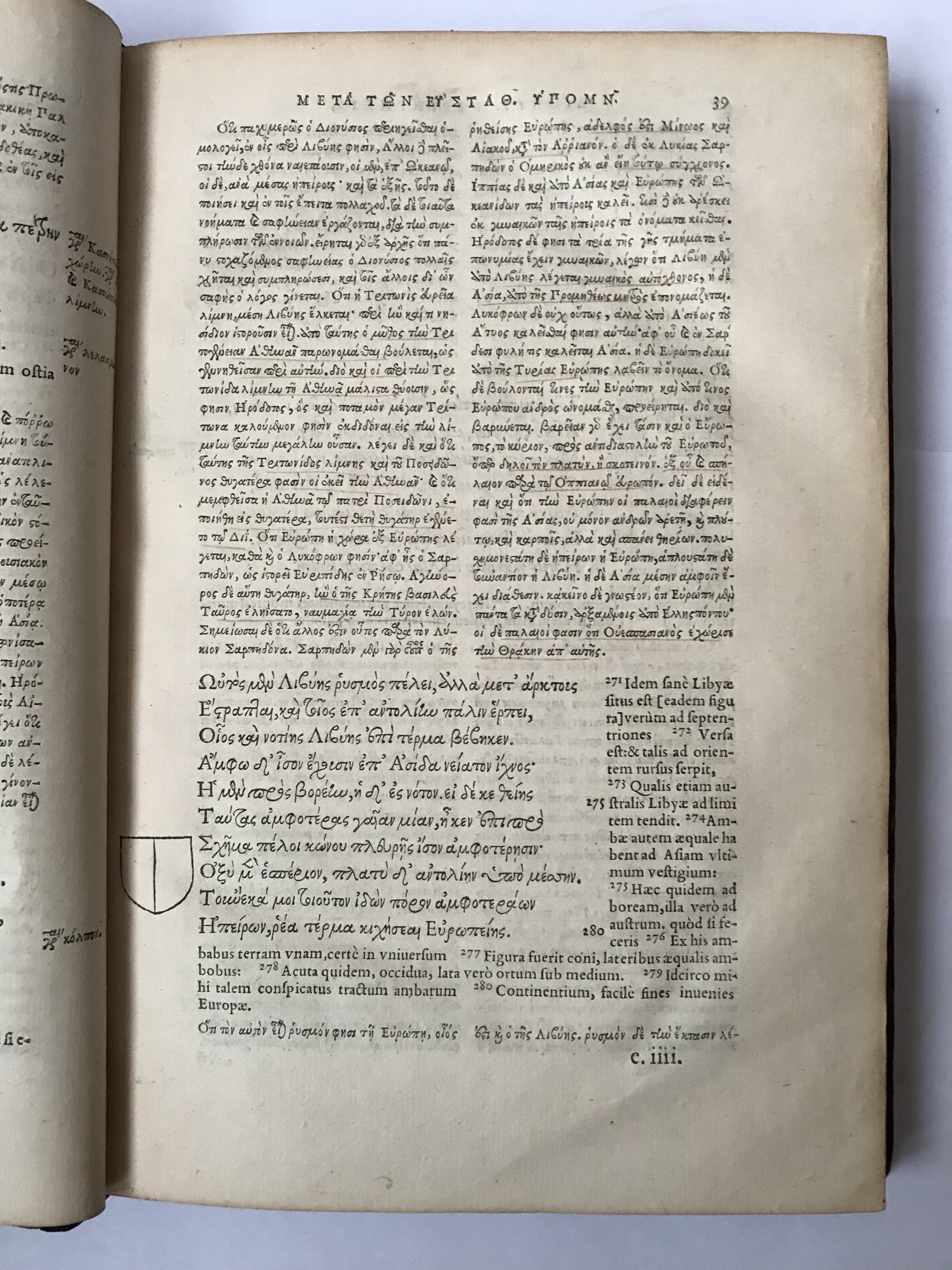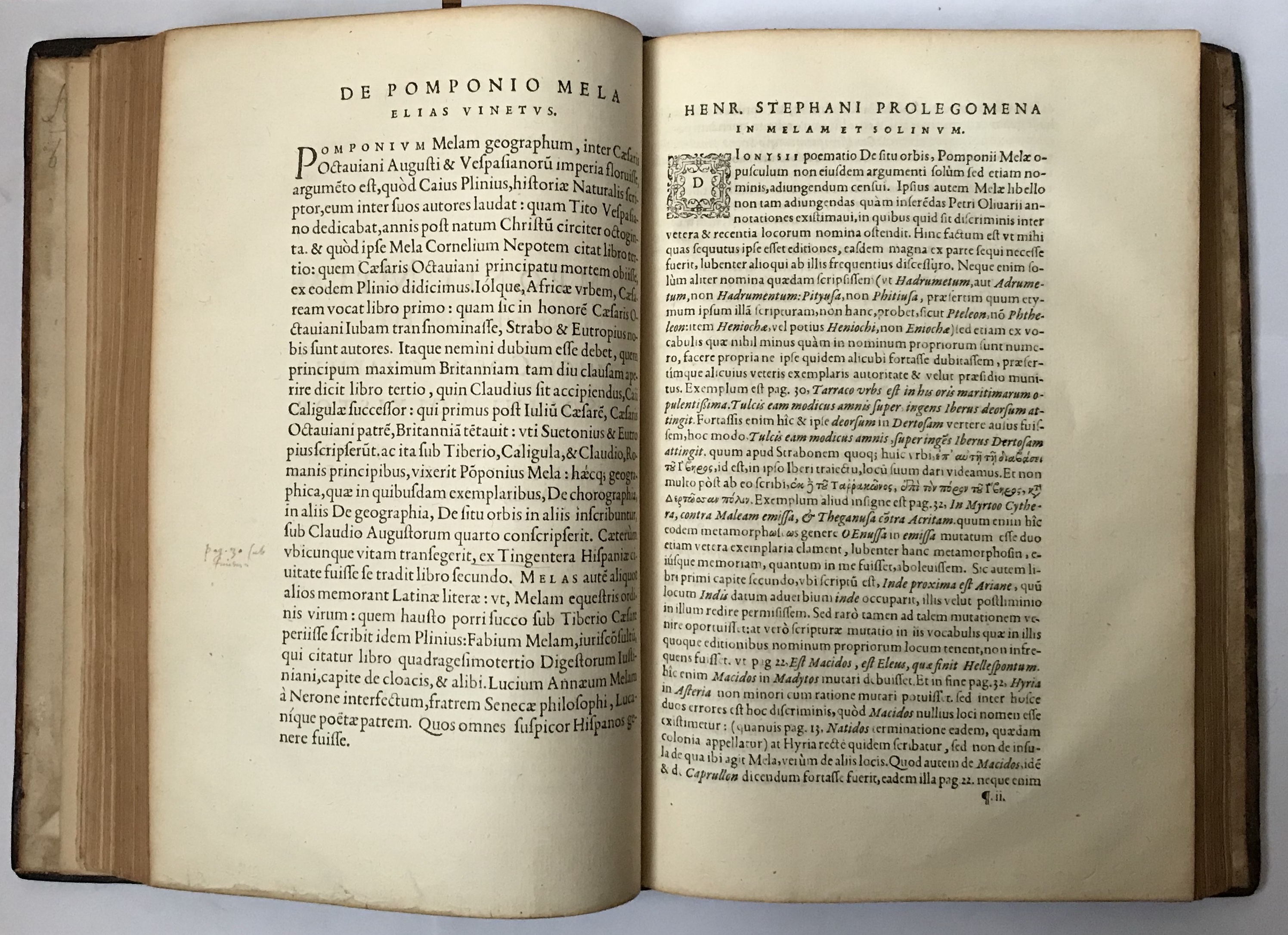This beautiful edition is a collection of Ancient Greek and Latin texts on geography and cosmography. It includes the famous ethno-geographical description of the world written by the historian Dionysius Periegetes, which was first published by Robert Estienne in 1547, who was the father of Henry, the printer of this edition. This collection includes Pomponius Mela’s De situ orbis, the cosmography of Aethicus Ister, and Gaius Julius Solinus’s Polyistor, which is a description of the curiosities of the world compiled in Late Antiquity. Except for the geographical parts of Pliny’s Historia naturalis, in which Mela is cited as an important authority, the De situ orbis is the only formal treatise on the subject in Classical Latin. This appears here with a commentary by the Spanish humanist Pedro Juan Oliver. The Polyistor is provided with a commentary by the hand of the Jesuit Martin Delrio. The Cosmography, which was issued under the name of Aethicus, its protagonist, is probably the work of a C8th writer, known as Pseudo-Jerome, who was close to the court historiographers of the early Carolingian period. Dionysius Periegetes came from Alexandria and is believed to have written his description at the time of the Roman Emperor Adrian.