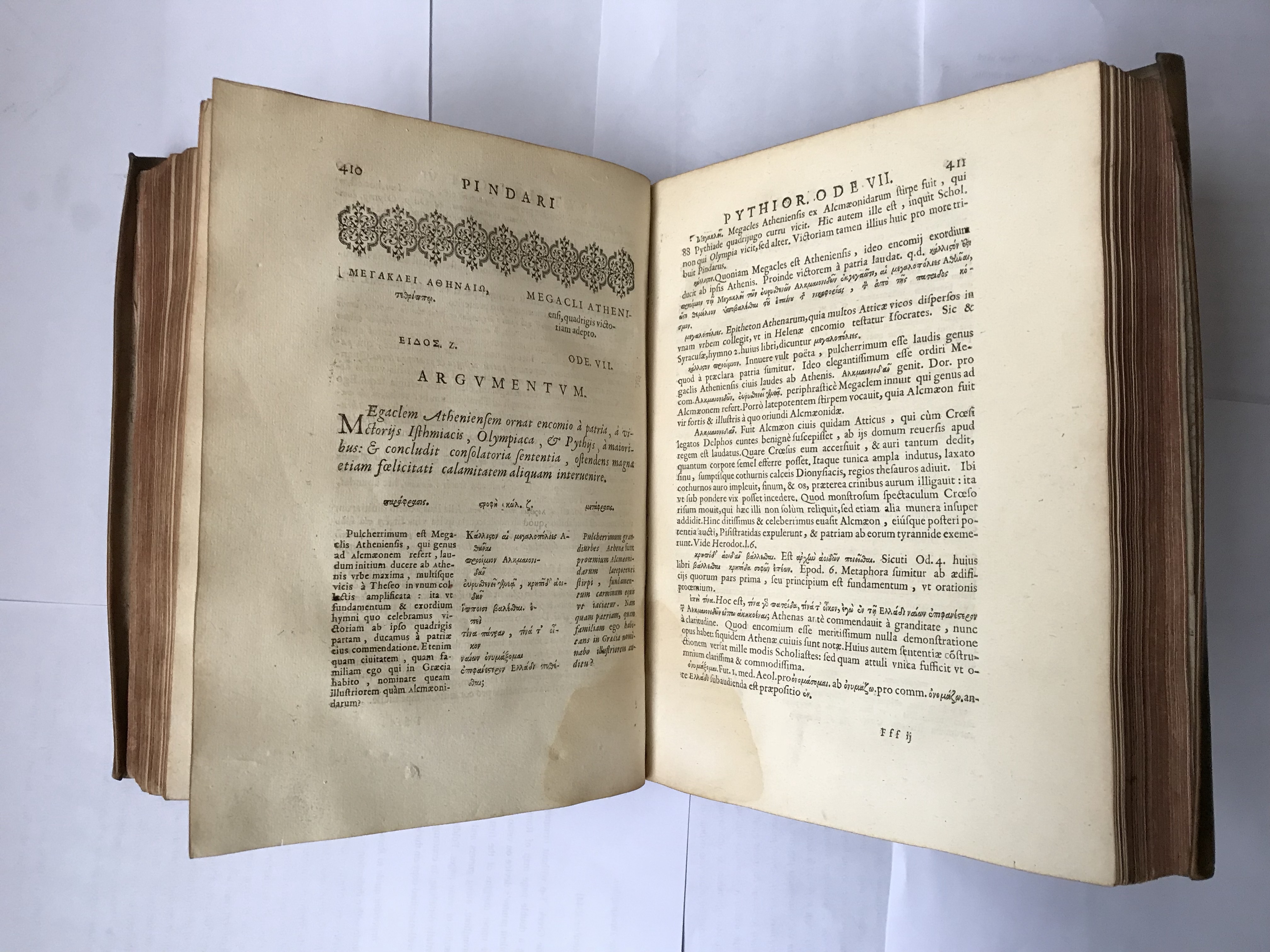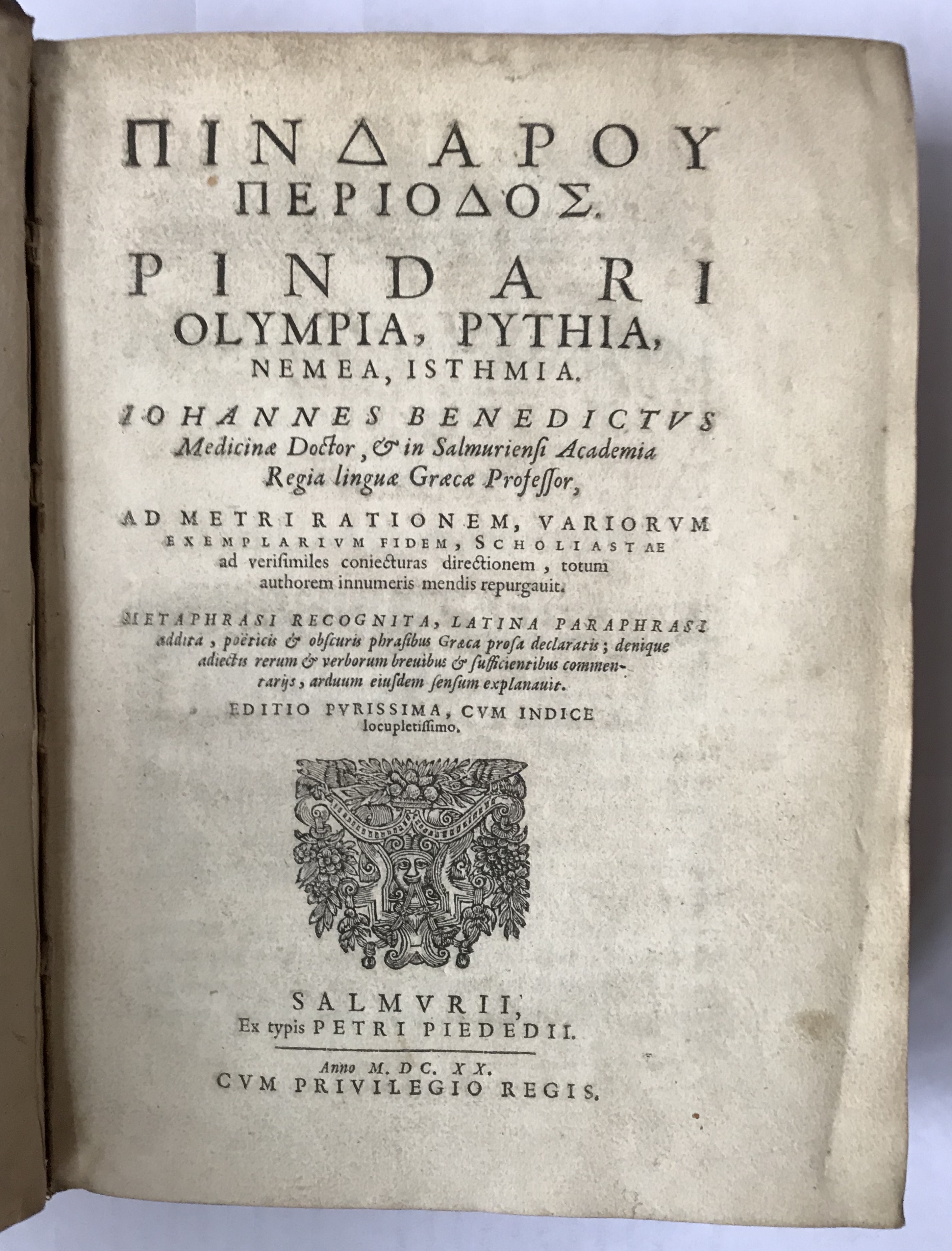 This is one of the most important early seventeenth-century editions of Pindar, which followed Erasmus Schmid’s edition (Wittenberg 1616). Johannes Benedictus, or Jean Benoist, was a German scholar and physician, King’s Professor of Greek in Saumur.