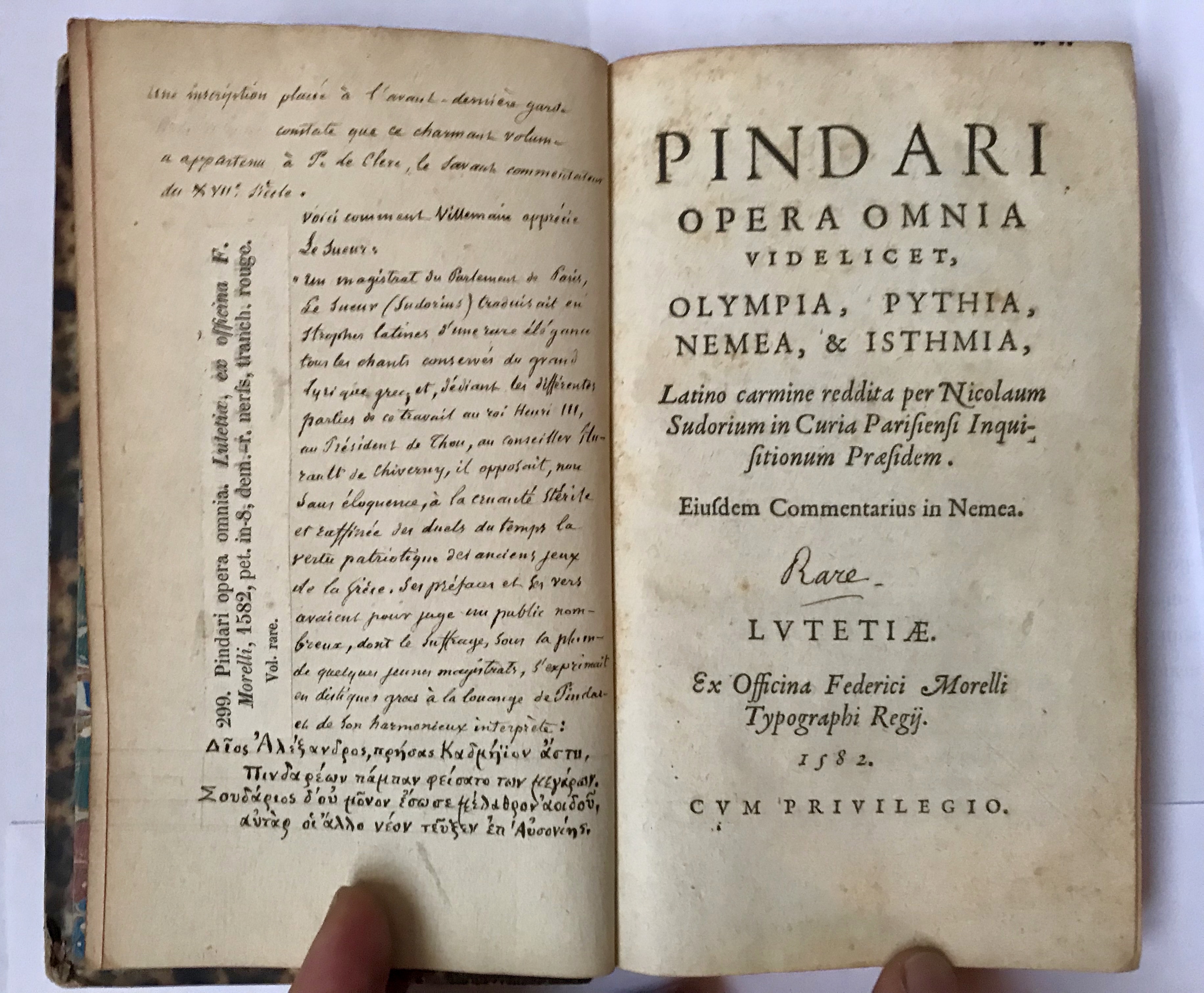 8vo, ff. (viii) 36, 50, 77 (iii), *8 A-I4 A-M4 N2 A-S4 T8. Italic and Roman letter, a little Greek. Each ode with title-page, of which only the Nemean bears the printer’s device (a fountain). Woodcut headpieces and decorated initials. Ownership inscription on verso of rear flyleaf: “Ex libris P. Clerici 10 Jul. 1655”; C19th handwriting: “rare” on t-p and extensive notes on verso of front endpaper: “une inscription placée à l’avant-dernière garde constate que ce charmant volume a appartenu à P. de Clerc, le savant commentateur du XVII° siècle”; beneath, a long passage by the same hand reports Abel-François Villemain’s judgment on the translator of this book, Le Sueur, plus two Greek couplets written by him in praise and imitation of Pindar; on the side, in vertical, a French bookseller label. Light marginal browning throughout, occasional underlining and marginalia in red, blue, and black ink, or pencil. In late C19th brown morocco and paper over boards, gilt-tooled title to spine and marbled pastedowns, a.e.r.. A fine copy.